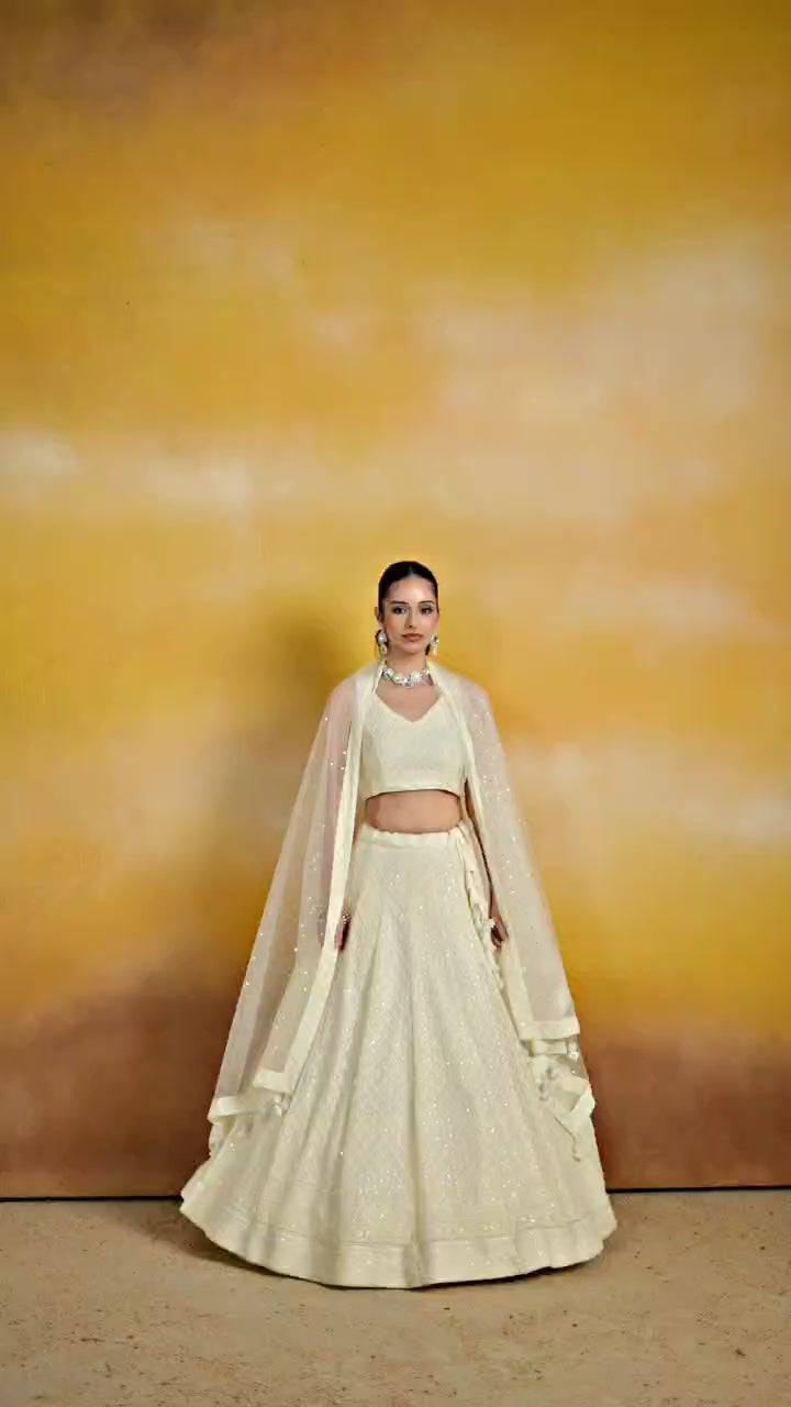 Embrace grace with this charming cream-white monochrome georgette lehenga choli, adorned with sequins and thread embroidery for a refined festive look.